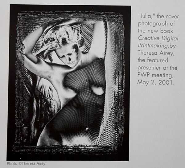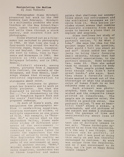 PWP sought to share some of these new ideas with its members. In the late 1980s, Joan Tedeschi wrote an article called “Manipulating the Medium” for the PWP Newsletter. In it she described the work of Diane Mitchell which involved “sandwiching negatives, creating montages of slides, or multiple exposures on one piece of film.” In a series of street scenes, different elements from different locations were combined to create “a place that is noplace (sic) and anyplace.” It sounds evocative, but laborious and imprecise.