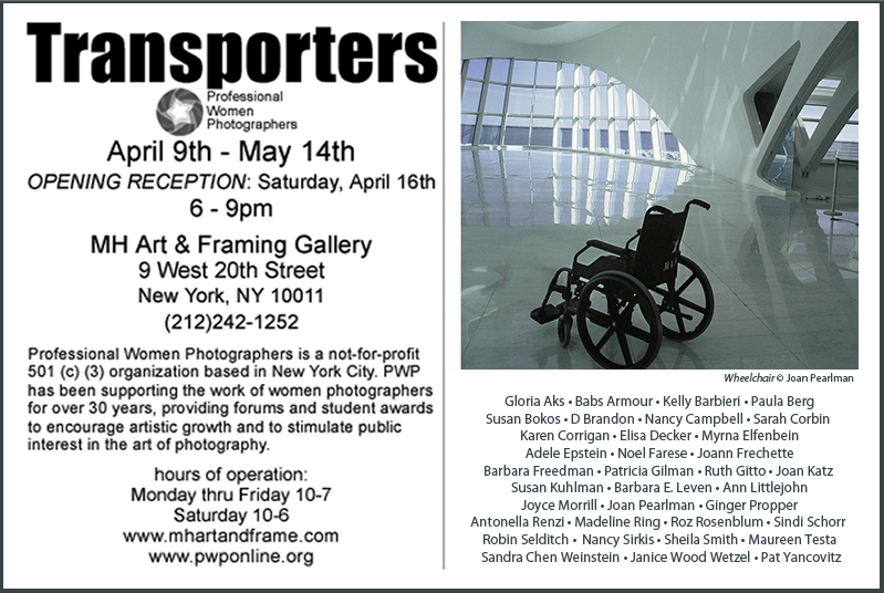 Please join us for the opening reception of Transporters on Saturday, April 16th, 6-9p, to celebrate this exciting new photography exhibition of PWP members. The exhibit, juried by Nick Rosal, runs from April 9th to May 14th, at MH Art & Framing Gallery at 9 West 20th Street, between 5th and 6th Ave. Gallery hours are Monday-Friday 10-7p, Saturday 10-6p. For more information, visit www.mhartandframe.com.